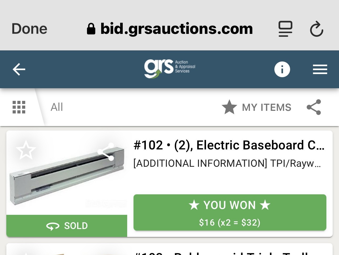 If you are using the GRS App, you will see a green bar with the words * You Won *. Winning bidders also receive a notification from GRS Auctions & Liquidations when the auction ends. You can also check the status of your bids in your account. After the auction ends, winning bidders will receive an email from GRS Auctions with your final invoice.
